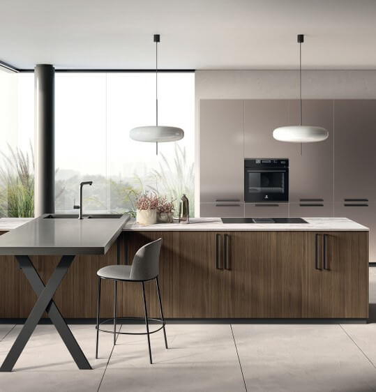 Para seleccionar su estética, ten en cuenta que el estilo puede ir acorde con el general de la estancia o tener una imagen distintiva. Sofisticación, versatilidad e innovación es lo que muestra la cocina de Scavolini de la propuesta, equipada con la colección Musa y con dos acabados de los frentes: lacado mate efecto nacarado en los armarios de pared y con textura gracias a las duelas en la completa isla de la que, además, nace una barra en perpendicular para las comidas informales. Esta es una cocina de estilo contemporánea llena de matices.