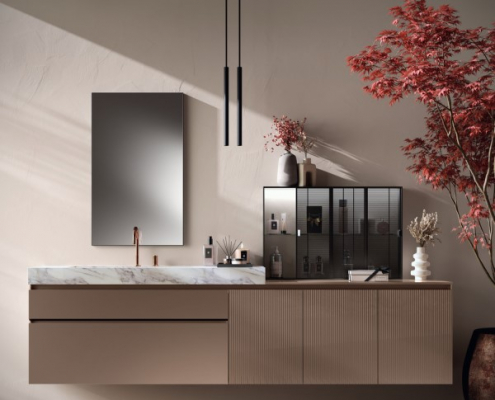 El rasgo distintivo del modelo es la puerta con escuadra de 22 mm combinada con la gola Round, cen color personalizable. Disponible en numerosas y fascinantes versiones, lo que llama la atención son las nuevas puertas con duelas, lacadas o de cristal, y los bastidores con malla metálica Round y Linear con los que poder crear composiciones sofisticadas, manteniendo un carácter equilibrado y elegante. Las nuevas tonalidades desarrolladas con efecto nacarado también son intensas y sofisticadas: Cuvée, Pas Dosé y Perlage saben sacar el máximo partido a esta colección de gusto contemporáneo.